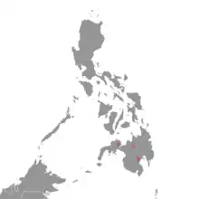 The species is native to the Kitanglad Mountain Range in Mindanao where it occurs on Mount Apo, Mount Kitanglad and Mount Malindang. It is found at altitudes of between 2,000 and 2,800 m (6,600 and 9,200 ft).[1] Its habitat is forests composed mostly of conifers and laurels up to 10 m (33 ft) high, with fallen trees, rhododendrons, other shrubs, ferns, orchids, mosses and lichens.[2]