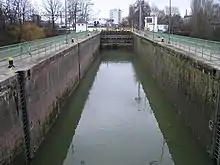 The Southern Link Canal on the right bank of the Weser has two locks and also connects the Mittelland Canal to the River Weser. Between the two locks is the industrial port of Minden and the entrance of the old Weser port with its disused Weser shipyard.
