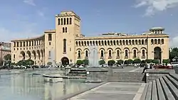 With the proclamation of independence of Armenia in 1991, the activities of the Ministry of Foreign Affairs of the Republic radically changed, taking into account the new status of Armenia in international relations. The structure of the Ministry and the quantity of staff were brought in line with the requirements of the foreign policy of an independent state. Its duties are enshrined in the Law on Consular Service.[3] A special body was created within the MFA to coordinate cooperation with the Armenian Diaspora at the state level, on the basis of which the Ministry of Diaspora was established in October 2008. The first assignment of diplomatic ranks was held in July 1992. Since 1996, the MFA of Armenia has been located at the Republic Square in Government House #2 (which was built in 1955 by architect Samvel Safarian). Between 1991-1996, the Ministry of Foreign Affairs was located currently where the Constitutional Court is located. The Foreign Ministry has its own awards, with the Commemorative Medal of the Ministry being instituted in 2002, and in 2009, the Medal “80 years of John Kirakosyan” was created.[2]