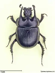 Typhaeus typhoeus, or the minotaur beetle, is a beetle in the family Geotrupidae, also referred to as earth-boring dung beetles. They are native to Europe.[2][3] The beetle is named after the Typhon, a giant of Greek mythology.