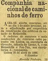 - ↑ Almeida Pinheiro: “Companhia nacional de caminhos de ferro” Diario Illustrado 4670 (1886.04.27)
