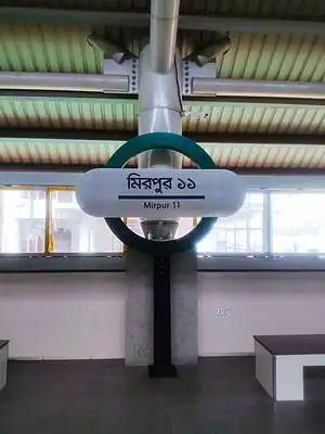 Mirpur 11 (Bengali: মিরপুর ১১, romanised: Mirpur egaro) is a metro station of the Dhaka Metro's MRT Line 6. This station is located in Mirpur, a suburb of Dhaka, Bangladesh. The station commenced operation from 15 March 2023.[2]