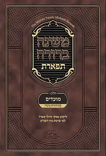 The Mishnah Berurah (Hebrew: משנה ברורה "Clear Teaching") is a work of halakha (Jewish law) by Rabbi Yisrael Meir Kagan (Poland, 1838–1933, also known as Chofetz Chaim). It is a commentary on Orach Chayim, the first section of the Shulchan Aruch which deals with laws of prayer, synagogue, Shabbat and holidays, summarizing the opinions of the Acharonim (post-Medieval rabbinic authorities) on that work.[1]