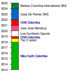 Colombia has been taking part in the Miss Grand International since 2013. However, most of its representatives were assigned to participate without organizing the national preliminary contest specifically. In 2018, the first edition of Miss Grand Colombia was conducted in Villeta of Cundinamarca Department at the BH Tempo Hotel on 11 February after Miss Earth Colombia, who served as the national licensee during 2013 – 2017, had lost the franchise to Top 3 Latam – the Cundinamarca-based pageant organizer, headed by Neyder Duarte.[1] The contest featured 5 national finalists representing 5 national regions, including Altiplano, Andean, Llanos, Orinoquía, and Sinú,[1] of which Génesis Andrea Quintero Pérez from Orinoquía was announced the winner and expected to compete in Myanmar for the international title,[7][8][9] but unfortunately forced to resign by the organizer due to health problems after having breast augmentation as well as the financial conflict between them.[8][10] The organizer then relinquished the franchise to the Concurso Nacional de Belleza de Colombia (CNB Colombia; Miss Colombia), who appointed Sheyla Quizena Nieto to compete at the said platform instead.[11][12] Nevertheless, Quintero was later assigned to participate in the following international edition in Venezuela by the 2019 national licensee – Luis Humberto Garcés, as the replacement of the former representative, Sthefany Rodríguez, the Colombian-Venezuelan model who resigned the title two months after the appointment;[13] and was placed among the top 20 finalists.[14] Since then, the license had been being transferred to the different organizers every year, including Juan José Mendoza in 2020,[15] back to Miss Colombia in 2021,[16] and under the control of César Prado in 2022.[3]
