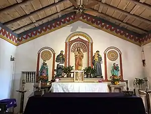 The Franciscan fathers chose this site for the Pala Mission because it was a traditional gathering place and village for the Native American residents. Father Peyrí oversaw the addition of a chapel and housing to the granary complex, which was constructed at the spot in 1810.[4] The chapel's interior wall surfaces featured paintings by native artists, originally measuring 144 by 27 feet. Workers went into the Palomar Mountains and cut down cedar trees to use as roof beams.[5]