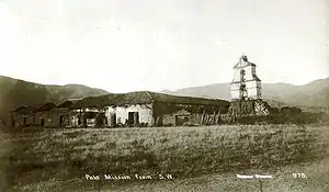 Pala Asistencia, with its original bell tower, circa 1875. The structure is loosely styled after a similar one at the Mission of Nuestra Señora de Guadalupe located in Juárez, Mexico.[10]