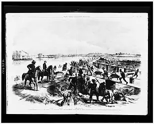 The laborers used mule powered machinery, scrapers, and wheelbarrows to construct the tightly packed slopes of dirt.[1] The levee camp season generally occurred most often from late fall to early winter when the Mississippi water levels were lowest. Approximately one third of the population of the camps consisted of black women, who were employed as cooks or prostitutes for the workers.[3] They also contained livestock including cows, horses, mules, and pigs to run machinery and provide sustenance for the workers.[2] Due to the Great Mississippi Flood of 1927, control of the camps shifted to the Mississippi Flood Control Act,[4] as government effort was placed more on flood relief.[5]