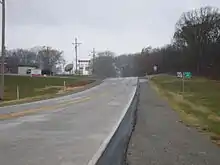 Route 66 begins at the Kansas state line in Jasper County, where it continues west into that state as K-66. From the state line, the route heads northeast on West 7th Street, a four-lane divided highway also marked as "Historic Route 66". The road intersects Old Route 66, at which point it curves to the east. Route 66 passes through wooded areas with some development, passing through Central City. Farther east, the median becomes a center left-turn lane as the highway passes businesses. The route crosses into Joplin and intersects the southern terminus of Route P. Route 66 continues as a four-lane undivided road through commercial areas, running to the north of a Missouri and Northern Arkansas Railroad line for a time. The road passes a mix of homes and businesses before it heads into downtown Joplin and intersects I-44 Bus./Route 43.[1]