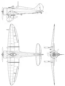 Mitsubishi assigned the task of designing the new fighter to a team led by Jiro Horikoshi (original creator of the similar but unsuccessful Mitsubishi 1MF10, and later responsible for the famous A6M Zero).[4] The resulting design, designated Ka-14 by Mitsubishi, was an all-metal low-wing fighter, with a thin elliptical inverted gull wing and a fixed undercarriage, which was chosen as the increase in performance (estimated as 10% in drag, but only a mere 3% increase in maximum speed) arising from use of a retractable undercarriage was not felt to justify the extra weight.[5][6] The first prototype, powered by a 447 kW (600 hp) Nakajima Kotobuki 5 radial engine, flew on 4 February 1935.[7] The aircraft far exceeded the requirements of the specification, with a maximum speed of 450 km/h (280 mph) being reached.[4] The second prototype was fitted with a revised, ungulled wing, and after various changes to maximize maneuverability and reduce drag, was ordered into production as the A5M.