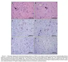 In a study investigating the effects of MODV on hamsters, severe encephalitis, bilateral hindlimb paralysis, and complete paralysis with an intact corneal reflex were observed.[1] MODV-induced encephalitis in hamsters was characterized by movement of monocytes and lymphocytes into the cortex and bulbus olfactorius, causing massive destruction of the tissue structure.[6] In all surviving hamsters, IgM and HI antibodies to MODV were present in the blood after subcutaneous infection.[1] Of all infected hamsters, no substantial microscopic lesions were observed in the liver, spleen, lung, and heart.[1] However, rare focal portal inflammation of the liver and mild reactive lymphoid hyperplasia of the spleen were noted. Considerable pathological changes were observed in the brain and spinal cord during early infection.[1] During early infection, the lesions in the spinal cord were more severe than those observed in the brain.[1] In immunocompetent mice, MODV causes 100% morbidity and mortality when the virus was inoculated directly into the brain.[6] Alternatively, when inoculated via the intranasal route, 50% morbidity and mortality was observed[6]