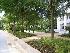 The square, originally planted with European tree species, is also elaborated with palm trees, north African, of great value. There is also a games area, with its cement tables for people to play table tennis. This game area overlooks Parc Montsouris.