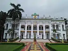 Chowdhury Lodge: The pillars of this pink building are built in the style of Roman architecture. Inside the beautifully designed building is a corrugated roof. In front of this two-story building there is a beautiful garden and green field.[8]
