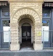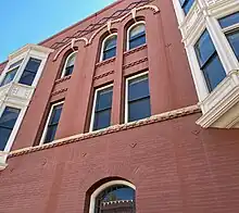 The 30,000-square-foot (2,800 m2) Moir Building stands as a three-story rectangular structure, crafted from brick and with sandstone, cast iron, and wood. The upper levels of this commercial and residential building are dominated by slanted bay windows and a rounded corner tower. The building's primary facade faces eastward, featuring architectural detailing. Its dimensions are 107 ft (33 m) in length by 76 ft (23 m) in width.[5] The building was completed in 1894 and designed by William D. Van Siclen.[1] Siclen was active as an architect in San Jose from 1892 until 1900.[9][3]
