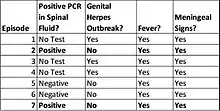 PCR testing has advanced the state of the art in research, but PCR can be negative in individuals with Mollaret's, even during episodes with severe symptoms. For example, Kojima et al. published a case study for an individual who was hospitalized repeatedly, and who had clinical symptoms including genital herpes lesions. However, the patient was sometimes negative for HSV-2 by PCR, even though his meningitis symptoms were severe. Treatment with acyclovir was successful, indicating that a herpes virus was the cause of his symptoms.[17]