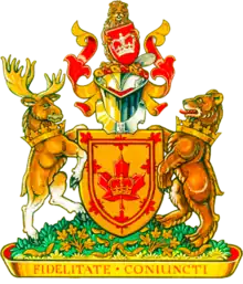 The coat of arms of the Monarchist League of Canada, granted by the Canadian Heraldic Authority with permission of Her Majesty The Queen.[4][5]