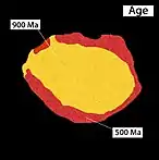 Zonation is a characteristic of monazite. A single monazite grain can contain domains of distinctively different compositions and ages. These domains are widely accepted to represent episodes in geological history with monazite growth or recrystallisation.[3][18] The key to monazite geochronology is to find out what geological events or environments a domain represents, by comparing its chemical composition with mineral stability and reactions. The age of the event is thus represented by the domain age.