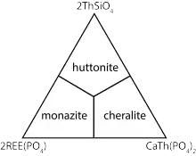 Different levels of substitution form a range of compositions, with endmembers monazite [2REE(PO4)], brabantite [Ca,Th(PO4)2] and huttonite [2ThSiO4]. The level of substitution usually depends upon melt composition and the geological environment.