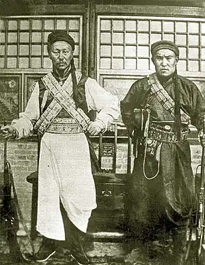 The Mongolian revolution was for the most part an orderly transference of power.[21] Its relatively peaceful character was due to the realism of Qing authorities in Mongolia, and in no small part to the presence of Russian troops, who provided protection for these authorities and Chinese troops. The situation was different in Inner Mongolia. There, Chinese authorities remained in power, even though Mongol activists were preparing to join Outer Mongolia in independence. Members of the pro-Qing Royalist Party were known to support the independence of Inner Mongolia, and some argued for a monarchist state covering Manchuria as well as Outer and Inner Mongolia. Most notably, Gungsangnorbu, leader of the Inner Mongolian Harqin Banner, forged close contacts with the Japanese in December 1911. He and other inner Mongolian princes took loans, promised the Japanese mining rights and received major arms shipments.[22]