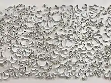 Rudquist was a recipient of the 2013 Artist Initiative Grant provided by the Minnesota State Arts Board.[10] Through this grant, she created and exhibited her work in her exhibition titled InContext. In November 2013-January 2014, this exhibition took place in the Emily Galusha Gallery at Northern Clay Center in Minneapolis, Minnesota.[4] The centerpiece of the show, "Intersection" measured 6.5 ft x 25 ft. This work "explored the interplay and patterns between the interior and exterior of form and the spaces created between the forms when they are set side-by-side." This show included wall, pedestal, and floor installations and all works had multiple pieces.[8] Intersection is made up of approximately one thousand smaller pieces, each with a small hole in the back for easy hanging.[11] "Intersections" is now permanently installed at the headquarters of LifeSource, a non-profit organization that facilitates organ and tissue transplants, in Minneapolis, Minnesota.[8] A LifeSource representative writes, “Each piece in this artwork stands on its own as a familiar and intimate vessel and yet is part of something bigger as the shapes are joined in unexpected ways. A space remains between the individual pieces, giving honor to the space between as much as the space contained within.”[12]