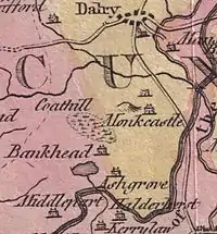 In 1866 the estate amounted to around 360 acres.[23] William Campbell Miller died intestate at the age of fifteen in 1857. At the time of his death his town residence was Saxe Coburg Hall, Edinburgh, and the following properties were listed in the inventory of his estate: Baidlandhill and Windyedge in the parish of Dalry; Hill of Fergushill, Kilwinning parish; Craighead, and Craighead Mill; High Monkcastle and Low Monkcastle; Hillend; Mansion House Grange; Cottages at Old House; Crofthead; Heatterhill; Bannock; and Monkridding House.[24]
