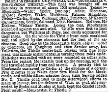 Monkcastle struggled because of the strength of football in Ayrshire. In the Ayrshire Cup, the club did not get past the second round until 1891–92. That season, it reached the quarter-final, and beat Stevenston Thistle ostensibly to reach the semi-final, but a protest overturned the result and Thistle won the replay.[20] It was the only time the club reached that stage.
