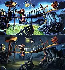 The game's artists and animators - as well as its composers - collaborated with LucasArts programmers to shape an engaging realization of the game's scenario, stylized to utilize cinematic techniques such as scrolling panoramas of the title's environments and proportional character scaling.[33] Less than a year after the launch of the game, Dave Grossman described aspects of its presentation with the term "interactive cartoon", in that the title was conducive to "crazy and cartoony" interactive sequences.[58] He cited the example of the game's sequence wherein Largo LaGrande extorted money and valuables from Guybrush Threepwood on the bridge leading to Woodtick, an event which Grossman said to prompt players "[to save] the game at that point so they could go back and watch it a few times".[58] Peter Chan said that the artistic direction of Monkey Island 2 was already decided when he joined its team, which focused his efforts on attempting to mimic existing visual references, although the corporate culture of LucasArts at the time allowed him opportunities to introduce unplanned graphical elements in the game.[62] In contrast, Ahern retrospectively voiced his discontent with some of the game's animation, which he said was uneven because of the animators' capability to add stylistically disparate graphics assets to the title without immediate supervision.[62] He explained that "there was nobody officially art directing [the game] and coming in and saying, 'No, that character's off-model, or that needs to look more like this'".[62] Ahern was frustrated with this situation, which he believed to be the source of a major stylistic dissonance between the game's individual animated scenes.[62] As a result of this experience, when Ahern was appointed to serve as an animator for Day of the Tentacle,[62] he requested LucasArts for the authority to institute uniform design criteria for that title's art team, so as to facilitate a cohesive artistic process.[62] Conversely, Grossman later indicated that Monkey Island 2's artwork–along with its music–imparted "a terrific sense of place" and a "tremendously cinematic" ambiance to the game.[50]