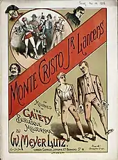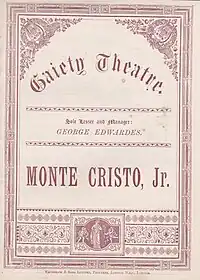 Monte Cristo Jr. was a Victorian burlesque with a libretto written by Richard Henry, a pseudonym for the writers Richard Butler and Henry Chance Newton. The score was composed by Meyer Lutz, Ivan Caryll, Hamilton Clarke, Tito Mattei, G. W. Hunt and Henry J. Leslie. The ballet and incidental dances were arranged by John D'Auban, and the theatre's musical director, Meyer Lutz, conducted.[1] The play's doggerel verse was loosely based on The Count of Monte Cristo by Alexandre Dumas.[2]