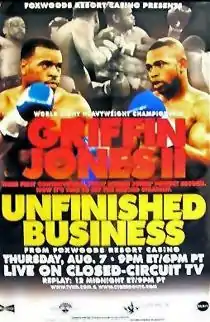 Though their first fight was closely contested through nine rounds, the rematch would last only 151 seconds. Less than 20 seconds into the fight, Jones sent Griffin down into the ropes with a left hook for an official knockdown. Following the knockdown, Jones stalked towards Griffin, constantly attacking him with power punches. Griffin attempted to keep Jones at bay with his jab but was unable to establish himself as he had in the previous fight. Then with around 42 seconds left in the round, Jones caught Griffin flush with a leaping left hook that put Griffin down on his back. Griffin attempted to get back up but was unable to find to his footing and was counted at the 2:31 mark of the first round. Jones was then declared the winner by knockout, once again becoming the WBC light heavyweight champion.[2]