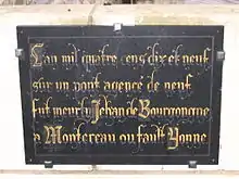 Plaque commemorating the murder of John the Fearless, on the bridge crossing the Yonne river.