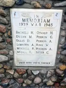 A number of residents of the town served as well as died in World War II. Michael Dusyk, of Montmartre was killed on September 27, 1944, and is buried at Gradara war cemetery, Pesaro, Italy. He was from a homestead southeast of Montmartre. Dusyk Lake, north east of Uranium City is named in his honour. Joseph Perron was killed on October 4, 1944, and is buried at Becklingen War Cemetery near Soltau, Germany. Perron Lake southeast of Fontaine Lake is named in his honour. Gaetan Perron died on October 4, 1945, and is buried at Holten Canadian War Cemetery, Netherlands. Perron Island in Oliver Lake is named in his honour. Others killed include Donald Hollowell, Spencer W. Hollowell, Rex Mitchell, Antoine Perron, and Aldon Joseph Rochon.[36]