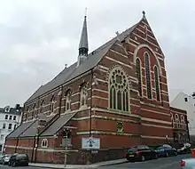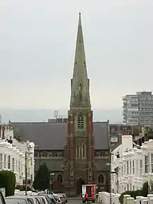 The Anglican St Michael and All Angels Church has been a centre of Anglo-Catholicism and High church worship since it opened in 1861. It was one of several daughter churches planted out of St Paul's Church in the early Victorian era.[71] George Frederick Bodley designed the original building on behalf of his friend Rev. Charles Beanlands, a curate at St Paul's, and work started in 1858. William Burges then supplied plans for an extension in 1865, but these were not executed until 1893–95 by J.S. Chapple, an architect from the recently deceased Burges' office. The two parts are connected by a four-bay arcade inside, and Bodley's original nave has become an aisle. The building is a tall red-brick and stone Gothic Revival structure with traceried lancet windows. The internal fittings combine "grandeur and artistry in a most satisfying way", and the 19th-century stained glass has been called the best in Sussex. The church is Grade I-listed.[72]