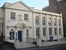 The Grade II*-listed[77] former St Stephen's Church on Montpelier Place closed in 1939 and is now used as a day centre for homeless people.[35] George Cheesman designed the plain stuccoed Classical façade, with Doric pilasters and an octagonal lantern,[78] in 1851. Behind it lies the opulent former ballroom of the Castle Inn, built by John Crunden in 1776 and later transported to Montpelier Place.[35] Arthur Blomfield made additions to the church in 1889. It was refurbished after a fire in 1988.[77]