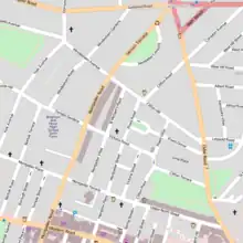 Powis Square is a rare example in Brighton of a fully enclosed inland square: most such developments are on the seafront, and its architectural details and scale are similar to these.[113] It is horseshoe-shaped, and one side is formed by Powis Road.[118] The square was developed by John Yearsley over a few years around 1850: the leasehold to the land was granted on 17 September 1846,[63] and in 1852 seven people had moved in and another 14 houses were built but unoccupied. In some cases façades were built first and the structure of the house came later. A builder called Stephen Davey was responsible for many of the houses, which were originally planned to be flat-fronted but which were given bow fronts when built.[113][119] They rise to three storeys and have features of Georgian, Victorian and Palladian design.[113][120] A small garden in the centre of the square, taken over by Brighton Corporation in 1887,[37] enhances its intimate scale.[2][9] Powis Road's houses are not listed, unlike those of Powis Square, and were built a decade later. They also have three storeys, and their façades have canted bay windows and cast iron balconies. St Michael and All Angels Church stands at the southern end.[67] Powis Grove leads through to the east side of Powis Square and has various buildings of the mid 19th-century,[2][118] and Powis Villas has some listed detached and semi-detached houses of the 1850s and a short terrace with a long canopied veranda.[51][118]