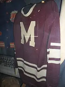 At the time of their founding, the Maroons had no nickname. The Maroons' president, James Strachan, had been the owner of the Wanderers in the 1900s. He attempted to secure the Wanderers name, but negotiations failed (Wanderers' last owner Sam Lichtenhein wanted CA$5,000 (equivalent to about $78,667 in 2021)[10]), so the club was known by its official name, the Montreal Professional Hockey Club.[11] With the team introducing maroon-coloured sweaters complete with a large capital letter "M" for a logo (the letter officially stood for their home city, not the colour) the "Maroons" nickname was picked up by the media. The club never officially changed the organizational name to incorporate the Maroons name.