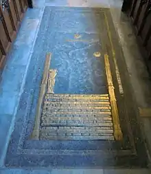 Nikolaus Pevsner in his The Buildings of England: Bedfordshire, the County of Huntingdon and Peterborough (1968) states that the surviving brass fragments on the monument were found in 1955 after a fire in the church caused the damaged tiles laid on the chancel floor during the restoration in 1870 to be lifted, revealing the tomb below.[5][12]