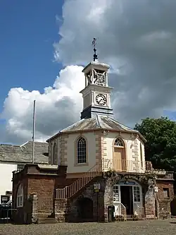 The first moot hall in the Market Place in Brampton dated back at least to the mid-17th century.[1] The Parliamentary forces of Oliver Cromwell, led by Major-General John Lambert, held 48 prisoners in the building in 1648 during the Second English Civil War.[2][3] Then, in November 1745, the area in front of the moot hall hosted the Army of the Young Pretender, Charles Edward Stuart, as he laid siege to Carlisle Castle during the Jacobite rising.[4]