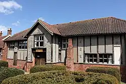 The building was designed in Tudor Revival style, built by local farm workers using timber frame construction techniques with a wattle and daub and brick nog infilling, and was completed in 1910.[5][6][7]