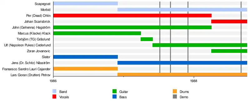 Morbid was formed in Stockholm at the end of 1986.[2] With Per "Dead" Ohlin as the group's founder and leader, there was a number of members before the band settled on the line-up of John "John Lennart" Hagström, "TG" on guitars, Jens Näsström on bass and Lars-Göran Petrov on drums.[2] When "TG" left the band, he was replaced by Ulf Cederlund.[2] The band then recorded their debut demo, December Moon, at Thunderload Studios in Stockholm on 5 and 6 December 1987.[3] This was the only recording featuring this line-up, as Hagström quit and Ohlin left for Norway to join the black metal band Mayhem.[4] The remains of the band tried to carry on, and brought in photographer John Scarisbrick as a new vocalist.[4] Scarisbrick lived near a recording studio named Sunlight, which would later gain some notoriety in death metal circles,[4] recording bands like Entombed[5] and Dismember. It was there that the band recorded their last release,[6] a demo titled The Last Supper, in September 1988.[4] The band faded as Petrov and Cederlund started Nihilist,[6] which eventually turned into Entombed.[7] Näsström later continued in the bands Contras and Skull.