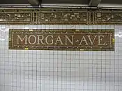Both platforms have large square columns tiled in white since they are below buildings and not the sidewalk.[17] All of them have name plates reading "MORGAN AVE" in black sans serif lettering on a white mosaic background.[17] The mosaic name plates on the columns are unusual to the subway system, since most of the system's station-pillar name plates are merely plaques.[18]
