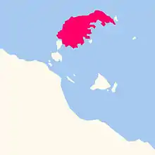The town of Gununa is located on the south-western end of the island[4] overlooking the Appel Channel (16°40′55″S 139°11′31″E / 16.682°S 139.192°E / -16.682; 139.192 (Appel Channel)) which separates it from Denham Island (16°42′52″S 139°09′35″E / 16.7144°S 139.1597°E / -16.7144; 139.1597 (Denham Island)).[5][6][7].