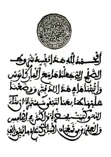 The Moroccan–American Treaty of Peace and Friendship, also known as the Treaty of Marrakesh,[1] was a bilateral agreement signed in 1786 that established diplomatic and commercial relations between the United States and Morocco.[2] It was the first treaty between the U.S. and an Arab, African, and Muslim nation, and initiated the longest unbroken diplomatic relationship in U.S. history.[3]