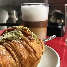 A pistachio croissant served with a nuṣṣ-nuṣṣ (نص-نص "half-half," a Moroccan variant of café crème), served at a café in Casablanca.