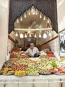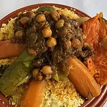 Moroccan cuisine (Arabic: المطبخ المغربي) is the cuisine of Morocco, fueled by interactions and exchanges with many cultures and nations over the centuries.[1] Moroccan cuisine is usually a mix of Berber, Andalusi, Mediterranean, and Arab cuisines, with minimal European (French and Spanish) and sub-Saharan influences.[2] Like the rest of the Maghrebi cuisine, Moroccan cuisine has more in common with Middle Eastern cuisine than with the rest of Africa.[3]