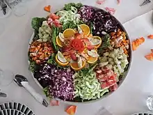 Salads include both raw and cooked vegetables, served either hot or cold.[24] include zaalouk, an aubergine and tomato mixture, and taktouka (a mixture of tomatoes, smoked green peppers, garlic, and spices) characteristic of the cities of Taza and Fes, in the Atlas.[24] Another cold salad is called bakoula, or khoubiza, consisting of braised mallow leaves, but can also be made with spinach or arugula, with parsley, cilantro, lemon, olive oil, and olives.