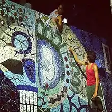 Mural Babilônia started to be created in January 2014. The first urban intervention, the main mosaic, covers approximately 140 square meters of a retention wall constructed by the city. It is located at the bottom of Babilônia favela. It was designed and created by plastic artists from Czech Republic, X-Dog and Plebe, with the help of dozens of voluntaries from all around the world.