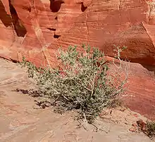 Mortonia utahensis is a species of flowering plant in the family Celastraceae known by the common name Utah mortonia. It is native to the southwestern United States, where it grows in desert and mountain scrub and woodland, often on limestone substrates. It is a broomlike shrub growing erect to a maximum height near 1.2 meters. Its branching stems are white to gray in color and rough-haired. The thick, curling, concave leaves are oval in shape, pointed or rounded at the tip, and up to about 1.5 centimeters long. The inflorescence is a narrow panicle of many flowers with five rough greenish sepals and five thin white petals a few millimeters long. The fruit is a cluster of nutlets.