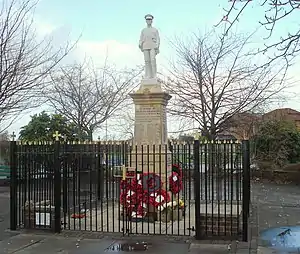 The memorial consists of the statue of a soldier in uniform standing on a plinth and a pedestal. It stands about 7 metres (23 ft) high.[1] At the bottom is a square base, on which is another base carved to resemble boulders. On this stands a pedestal with a cornice and a plinth; all these are in yellow sandstone.[2] On the plinth is the marble statue of a soldier. He is in the uniform of the Cheshire Regiment, and is standing at ease, holding a rifle.[1] Behind the soldier is a shattered tree trunk.[3] The memorial is surrounded by paving, and a wrought iron fence consisting of railings and ten posts. It is painted black, and on the posts are crosses painted gold.[2]