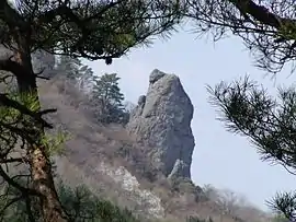 The mountain is strongly associated with the Ubasuteyama legend, which is mentioned in the Kokin Wakashū poetry anthology of 905 AD, indicating that the legend itself was much older. Per Japanese folklore, the pre-modern Japanese practiced senicide, whereby an infirm or elderly relative who were a burden on the community were taken to a remote, desolate place, and left there to die.[1][2] The identification of Mount Kamuriki as this location appears to be from legends in the Yamato Monogatari (951 AD), the Sarashina Nikki (1059 AD), and the Konjaku Monogatarishū, (c.1120 AD) among others. The mountain has a landform (the Bokodaki Iwa), which resembles a person carrying another person on his back up the mountain.