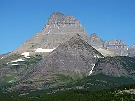 Like other mountains in Glacier National Park, the peak is composed of sedimentary rock laid down during the Precambrian to Jurassic periods. Formed in shallow seas, this sedimentary rock was initially uplifted beginning 170 million years ago when the Lewis Overthrust fault pushed an enormous slab of precambrian rocks 3 mi (4.8 km) thick, 50 miles (80 km) wide and 160 miles (260 km) long over younger rock of the cretaceous period.[7] The bulk of the peak is composed of limestone of the Siyeh Formation, and the conspicuous dark band is a diorite sill.[8]