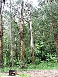 The wet, mountain rainforest of mountain ash (with at least one specimen 90 metres tall, 7 metres wide and approaching the age of 300 years), blackwood and mountain grey gum supports a wide variety of plants and animals, such as the tree ferns, wombat, possum, platypus, crimson rosella, lyrebird and many others.